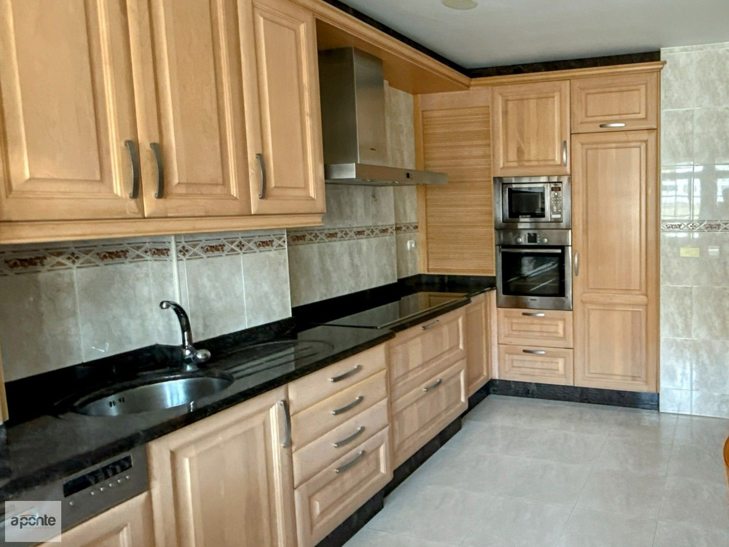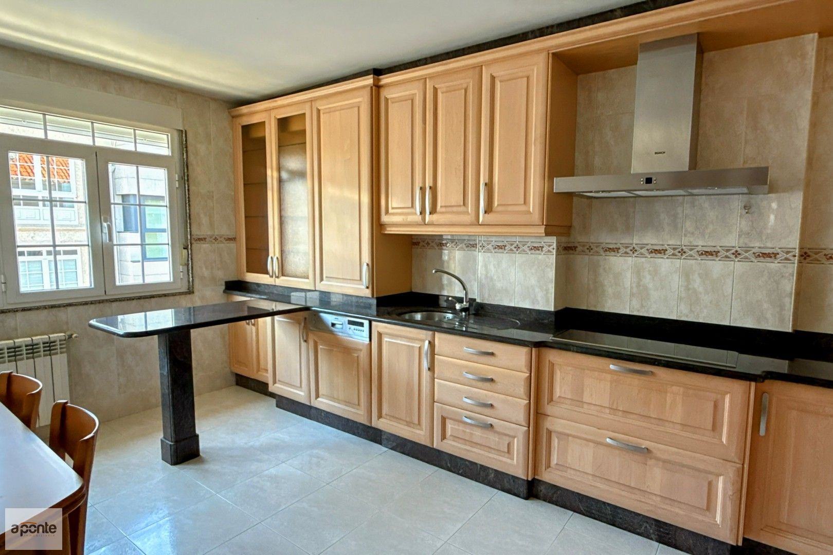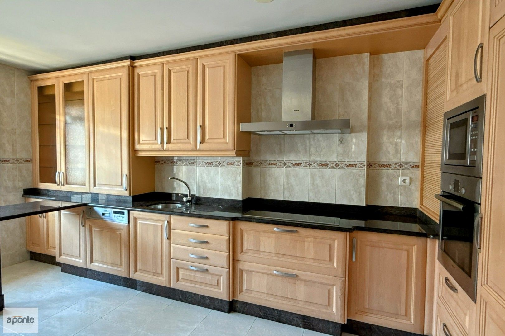 La cocina está totalmente equipada con electrodomésticos Bosch: lavavajillas, horno, placa vitrocerámica de 90 cm, frigorífico y microondas.